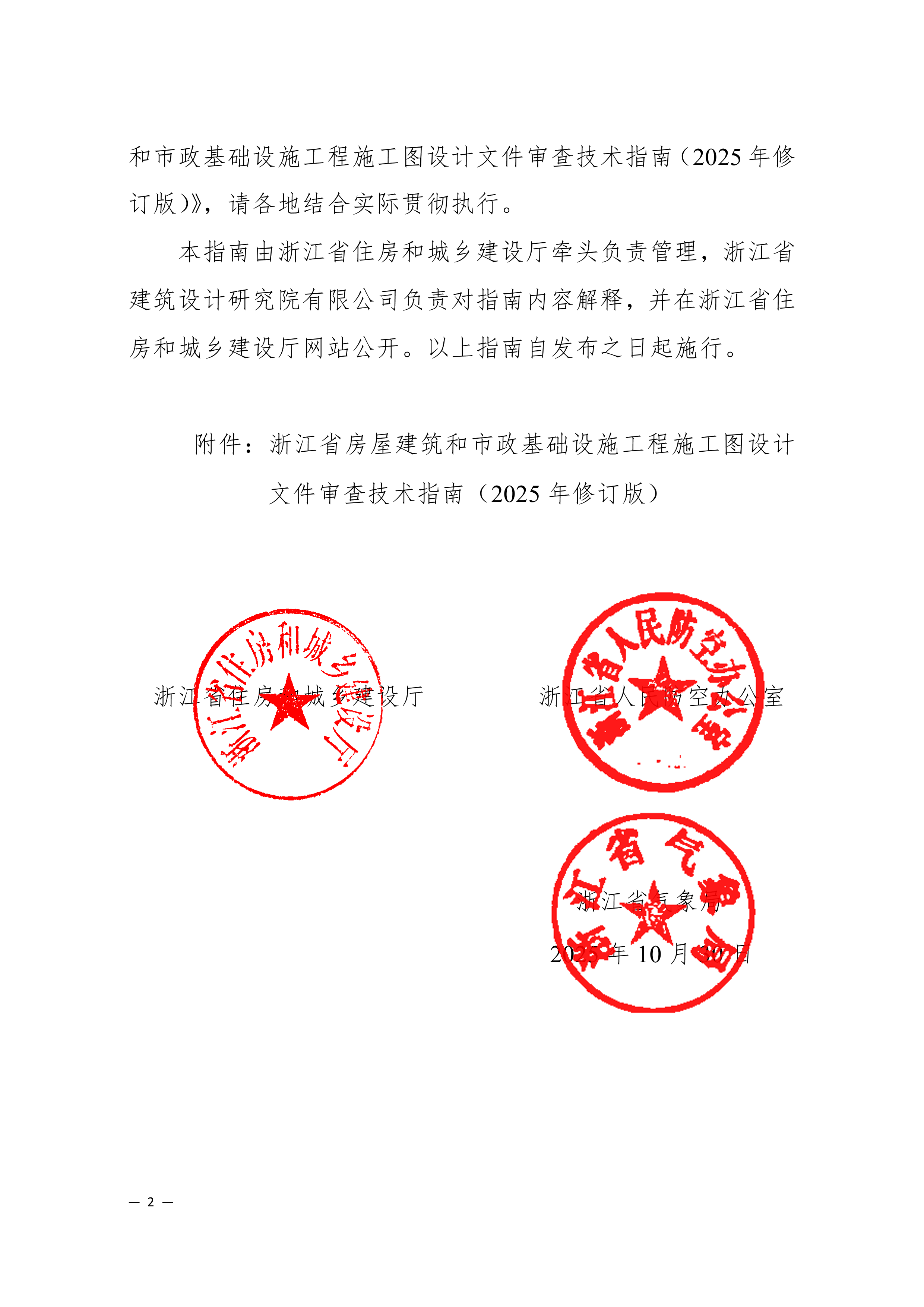 省建设厅 省人防办 省气象局关于发布 《浙江省房屋建筑和市政基础设施工程 施工图设计文件审查技术指南 (2025 年修订版)》的公告