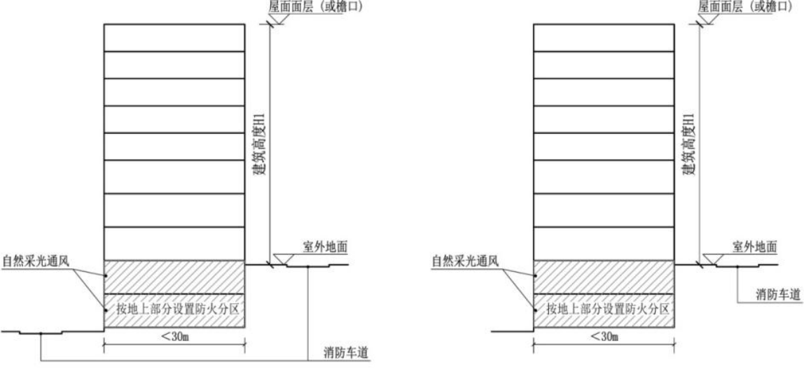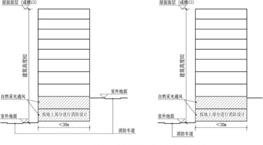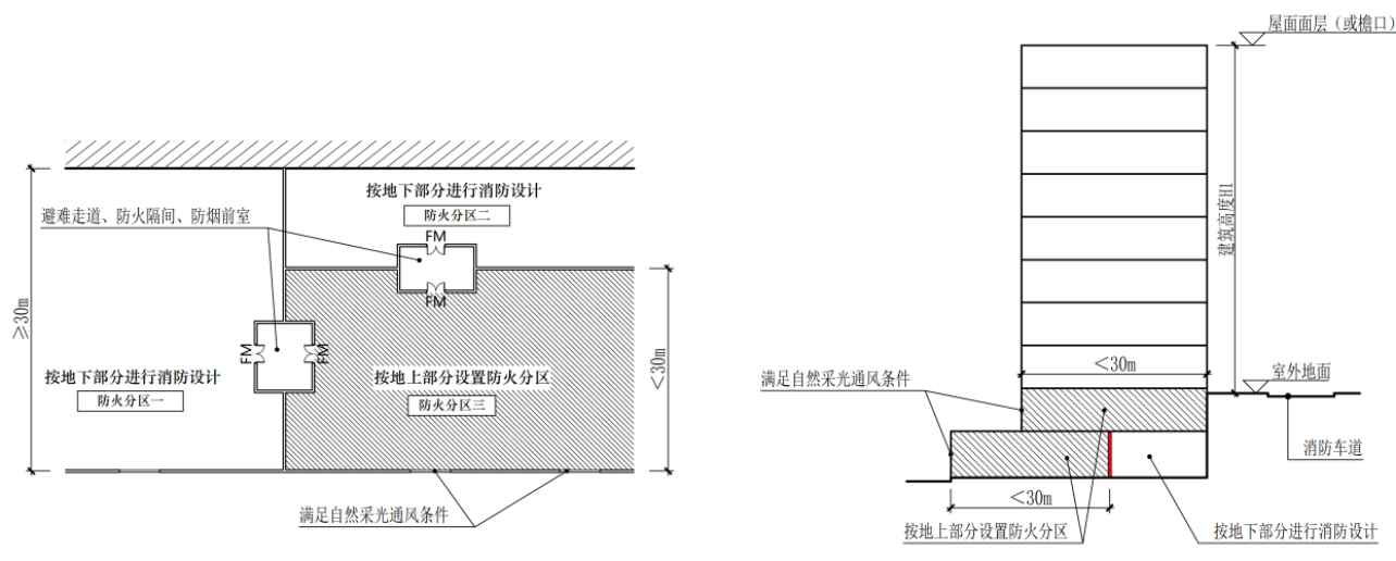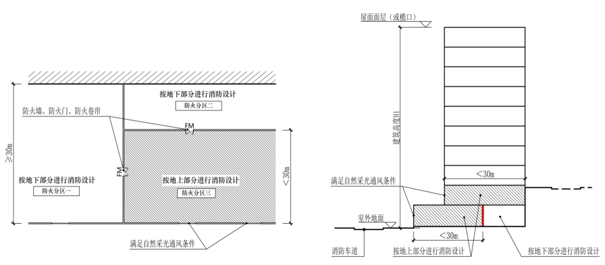 3 当按较低的室外地坪起算建筑高度时,低于较高地坪的房间,可按地上部分进行消防设计;但当建筑内部空间距外墙临空处进深大于30m或不具备自然采光通风条件时,该空间应按照地下室进行消防设计,且与按地上部分进行消防设计的部分之间应采取防火墙、防火门、防火卷帘分隔划为不同的防火分区。(附图1.2.2-3)