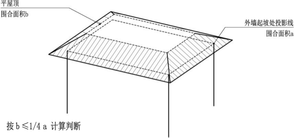 1.1.3 住宅建筑单元平-坡结合的屋面,应按照最高屋面计算建筑高度,当平屋顶部分占屋面面积(按照建筑外墙面起坡处投影线起算围合面积)不大于1/4的,可按第1.1.4条规定计算建筑高度。(附图1.1.3)