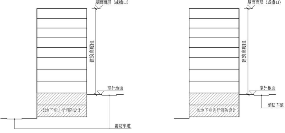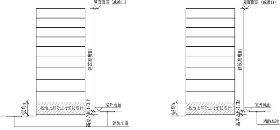 2 当按较高的室外地坪起算建筑高度时,低于较高地坪的房间地面与较高地坪的高差小于其层高的1/3时(从较高地坪起算为地上房间),可按地上部分进行消防设计;(附图1.2.2-2)