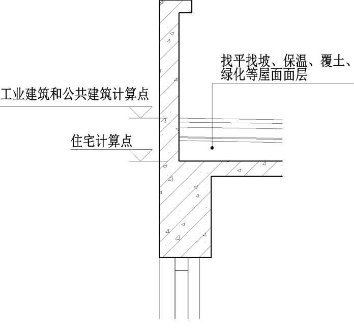 1.1.4 建筑屋面坡度不大于3% 时,建筑高度计算时,屋面面层算至靠外墙处的屋面最低点。工业建筑和公共建筑(含商业和住宅组合建筑)屋面面层算至屋面的建筑完成面(包含绿化层、保温层等屋面构造厚度);住宅(含设置商业服务网点的住宅)屋面面层可算至屋面结构板面。(附图1.1.4)