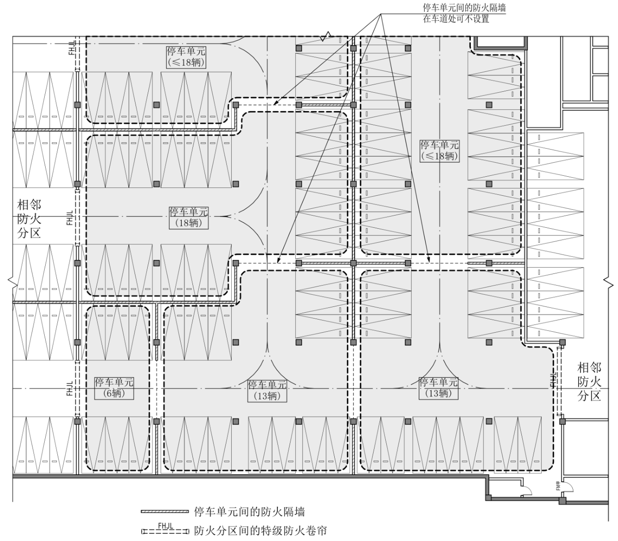 2 除行车道外,相邻两个停车单元之间、停车单元与其他停车位之间应采用耐火极限不低于2.00h的防火隔墙,隔墙高度不应小于1.8m;