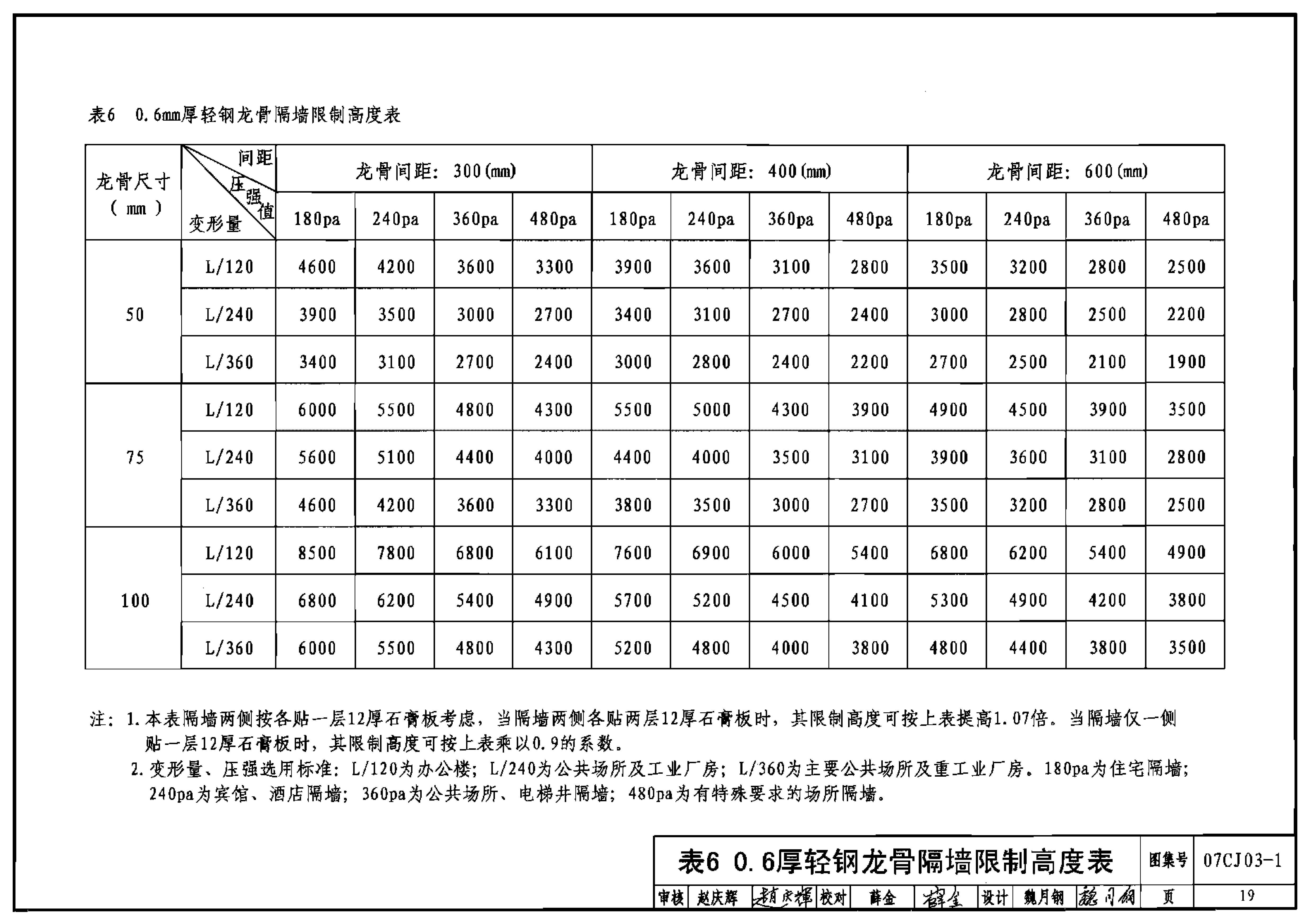 表6 0.6厚轻钢龙骨隔墙限制高度表