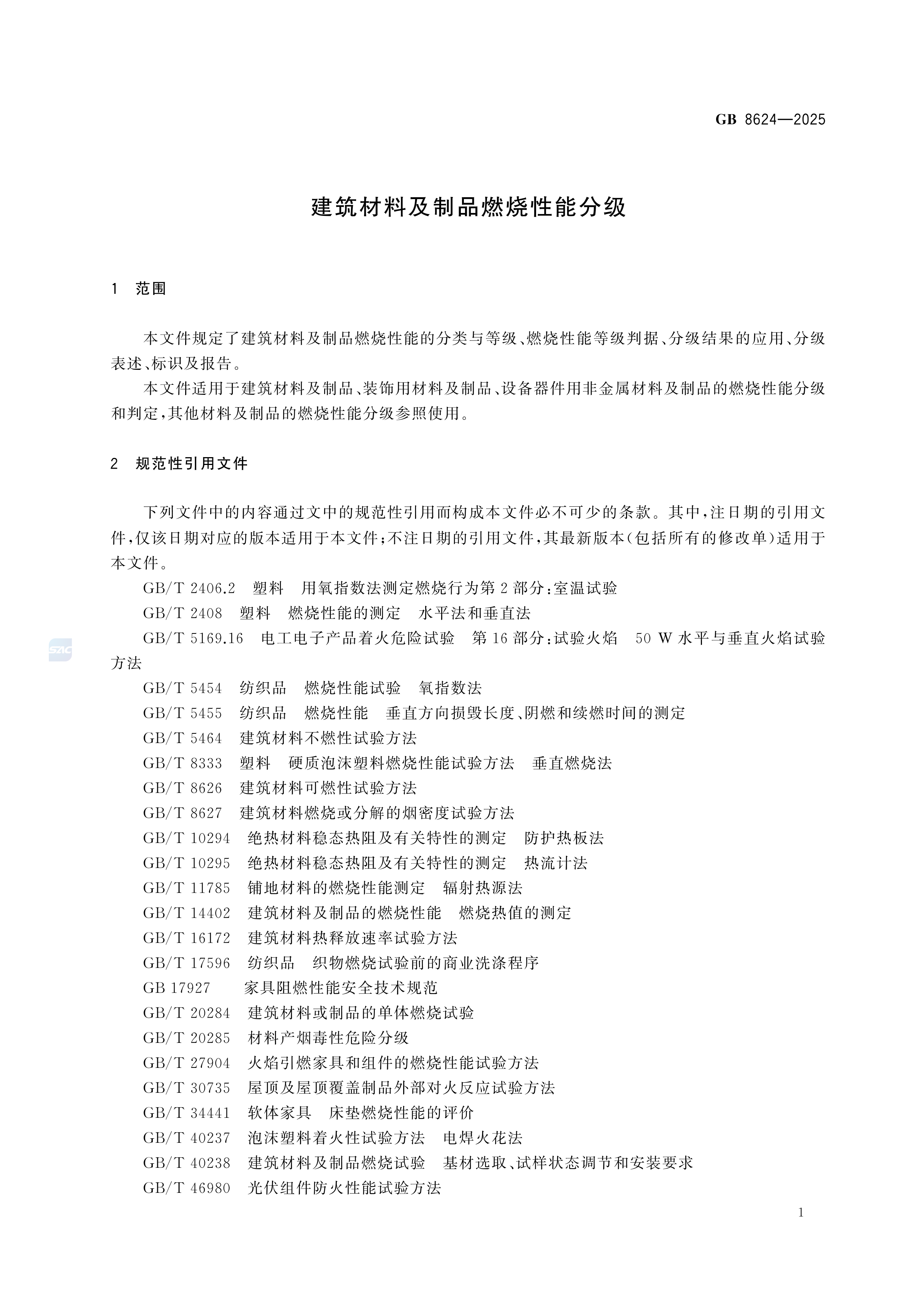 建筑材料及制品燃烧性能分级 GB8624-2025